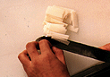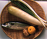 | 4.大根は皮をむき、厚い目の短冊に切る。さっと塩茹でして水に落とし、水気を切る。 | 5.青葱は3cm長さに切り、切り開いて繊維にそって千切りし水にさらし、針葱にする。白葱も同様にする。 | 6.柚子は皮の部分をむき、みじん切りにする。 |