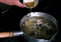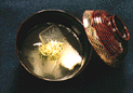 | 7.分量の水と昆布、3の鯖の身とあらを鍋に入れ、強火にかけ、沸騰したら弱火にする。あくをとりながら約10分ほど煮たら鯖の身を取り出す。 | 8.汁をペーパータオルでこし、再び火にかけて、味を確かめてから塩、薄口醤油で、酒で味を整える。 | 9.大根、鯖の身を戻し入れ、一煮立ちしたら椀に盛り熱い汁を注ぐ。生姜の絞り汁を数滴落とし、針葱と柚子の微塵切りを混ぜ合わせたものを上にのせる。 |