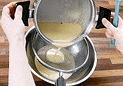 1.板ゼラチンをもどす。2.氷水に当てながら生クリームを泡立て、冷蔵庫に入れておく。氷水は、使用するので残しておく。