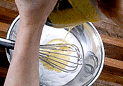 バヴァロワ 牛乳……………………………250ccバニラのさや…………………1/4本卵黄……………………………3個砂糖……………………………60g板ゼラチン……………………9g生クリーム……………………200ccバニラエッセンス……………適量 鍋(直径18cm)…………………1ボウル(直径18〜21cm)……2〜3*木ベラ……………………………1コルヌ又はゴムベラ……………1*泡立て器…………………………1裏ごし器又は粉ふるい…………1衛生面から、火を入れた物と入れてない物は分けて使うこと 1.板ゼラチンをもどす。2.氷水に当てながら生クリームを泡立て、冷蔵庫に入れておく。氷水は、使用するので残しておく。 <クレーム・アングレーズを作る>