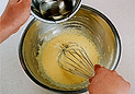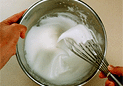 シフォンケーキ <生地> 卵黄…………………………3個砂糖…………………………35g 塩……………………………ひとつまみ水……………………………50mlサラダ油……………………50ml レモンの汁…………………1/2個 レモンの皮…………………1/2個 薄力粉………………………70g ベーキングパウダー………2g卵白…………………………120g砂糖…………………………35g <仕上げ> 粉砂糖または泡立てた生クリーム ボウル(直径24cmぐらいのもの)…………………2個 泡立て器………………………………………………2本木ベラかゴムべら……………………………………1本 シフォンケーキ型(直径16,5センチのもの)…1個 1.オーブンは180度に温めておく。2.小麦粉とベーキングパウダーは合わせてふるう。3.型の中心部分に薄くバターを塗り、紙を貼り付ける。 ○