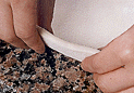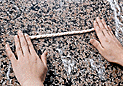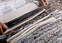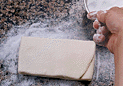 1.フィユタージュの表面と、台との間にたっぷりの砂糖をまぶす。