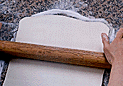 2.砂糖を打ち粉の代わりにたくさん使用して、適度な厚みにのばす。