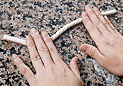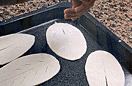<フイユタージュを作る><成形する> 成形 1.フィユタージュの表面と、台との間にたっぷりの砂糖をまぶす。 このとき使用する砂糖は、細かめのグラニュー糖がよい。上白糖の場合、水分が多いため広がりにくく、生地の表面もベタついてしまう。 2.砂糖を打ち粉の代わりにたくさん使用して、適度な厚みにのばす。 甘味を控えたい場合は、砂糖を少なめにする。 サクリスタンを作る。 リーフパイを作る。