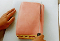 | | 3.冷やし固めたケーキの表面に残しておいたクリームを表面に薄く塗り広げる | 4.のばしておいたマジパンをかぶせる。 | 5.温めた包丁でいちごの断面が見えるぐらいまで4辺を切り落とす。 | | | | |