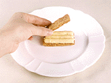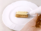 間にいちご等フルーツをはさむ場合、クリームを接着程度の少量で絞り、フルーツを乗せてからすき間を埋めるようにクリームを絞る。