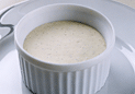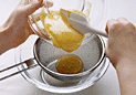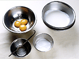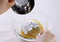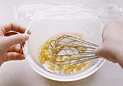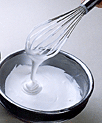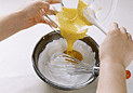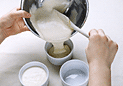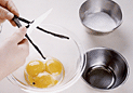 パルフェ (直径6cmのセルクル5個分)卵黄………………………………………3個 砂糖………………………………………45g 水…………………………………………15ml バニラのさや……………………………1本 生クリーム………………………………200ml ガラスのボール………………………………1 ボウル(直径18〜21cm) 2〜3 …………1 コルヌ又はゴムベラ…………………………1 泡立て器………………………………………1 裏ごし器又は粉ふるい………………………1 電子レンジ……………………………………1 冷やし固める器(型)………………………好みのもの 1.生クリームを氷水に当てながら少しとろみがつくまで泡立て、冷蔵庫に入れておく。氷水は、使用するので残しておく。