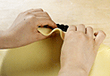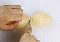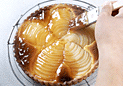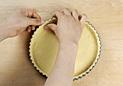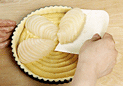 <パート・シュクレを作る> ◯<パート・シュクレを伸ばし、型にしき込む> 1.冷やし固めた生地を、めん棒で叩きながら伸ばしやすい固さにそろえる。 2.打ち粉を使いながら、丸くまとめる。 3.頻繁に向きを変えながらめん棒を前後に転がして、丸く伸ばす。大きくなればめん棒にまきとって向きを変えると良い。打ち粉をするのも忘れずに。 4.型より少し大きめに伸ばす。 5.めん棒に生地を巻き取って、型の上に広げる。生地が柔らかくなっていれば、その重みで切れてしまうので、作業しやすい固さになるまで1度冷蔵庫で冷やした方が良い。 6.型を回しながら、型の底にすき間が出来ないように生地を入れ込んでいく。 7.余分な生地を、めん棒で切り取る。 8.型に敷き込んで、冷蔵庫で約30分冷やす。 <クレーム・ダマンドを作る> ◯<焼く> 1.洋梨を出来るだけ薄く、同じ幅に切る。 2.フォークで底の部分に穴を開ける。型と生地との間の空気が抜け、底を平らに焼く事が出来る。 3.クレームダマンドを絞る。 4.洋梨を並べる。 5.180℃のオーブンで、約30分焼く。 <ジャムを煮詰める> ◯<ジャムを塗って仕上げる> 1.ジャムを手早く塗る。 2.ジャムが冷めて固まれば、出来上がり。 パートシュクレは、冷え固まるまでに2〜3時間かかりますので(冷蔵庫によって違いますが・・・)前日に作って置いても良いでしょう。 パートシュクレを扱う時は、夏はクーラーのきいた部屋、冬は暖房のきいてない部屋で手早く作業して下さい。(冷凍庫で)冷やした板の上で伸ばすと、生地がべたつかず、とても伸ばしやすいです。 洋なしのコンポートは、手作りだといっそう美味しいです。
