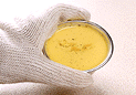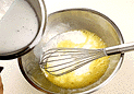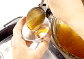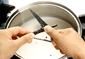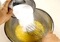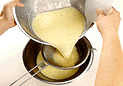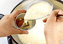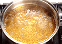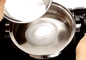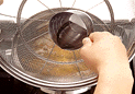 キャラメルがとびはねて火傷しないように、ザールでカバーする。手早く行い、手はすぐに鍋の上から移動させる。