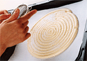 1. 1.9〜10mmの口金を着けた絞り出し袋に生地を入れ、底用として描いた円の少し内側まで渦巻きに絞る。砂糖を2回に分けて振る。