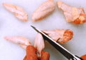 1.鶏の手羽は、先端の手羽先の部分を切り落とし、関節で2つに切り分ける。