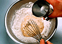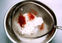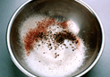 | 1.ボールに小麦粉、コーンスターチ、ベーキングパウダー、塩、カイエンヌペパー、 パプリカをふるい入れる。 |