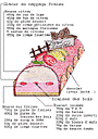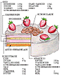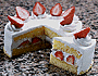 | フランス版苺ショート・ケーキ。バター・クリームまたカスタード・クリームを合わせたクレーム・ムースリーヌとマジパンを組み合わせたしつこそうなケーキですが、苺がそれらを和らげ、苺の風味を充分に引き出してくれるケーキです。 | ||