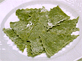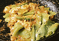 パスタは、セモリナ粉と強力粉にホーレン草のピューレを加えたものを、ストラッチ(布きれ風)に切ったものを用意。 |