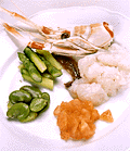 手長エビはひとくち大にぶつ切り。アスパラガスとそら豆は下茹でし、トマトはそのままで切っておく。 |