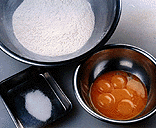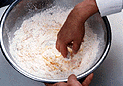 強力粉と塩、卵黄を混ぜる。始めは指先でかき混ぜ、モロモロになってきたら、手の平で体重をかけて、ひと塊になるまでこねる。