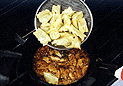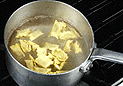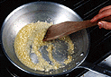 5.鍋にバージンオイルを入れ、にんにくを中火で炒める。にんにくの香りが出てきたら、玉ネギを時間をかけて弱火でじっくりと炒める。 |