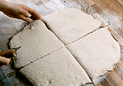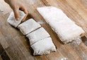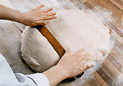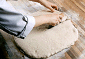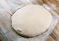 きれいな面が上になるように、発酵させた生地をおく。麺棒で厚さ1.5mmに伸ばす。