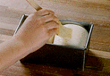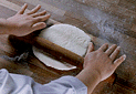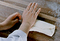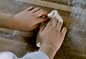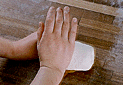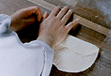 生地の奥から3分の1折り、180度回転。同様に折る。