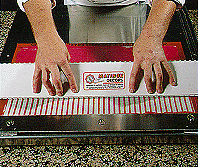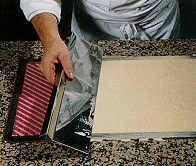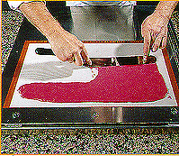 1.シガレット生地を作って色付け、シルパット(silpat)に薄く塗り伸ばす。  2.1の表面にペーニュ(peigne)を用いて模様を入れ、冷凍庫で生地を冷やし固める。