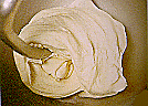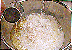 2. 軽く混ぜ合わせて生地の固さを調べ、さらに水を加えて固さを調節する。
