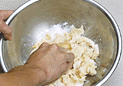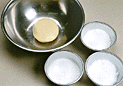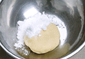 ボールの中の黄味餡へ餅粉、上用粉、上白糖を加える。