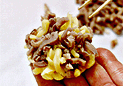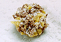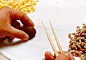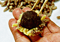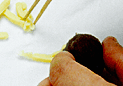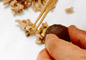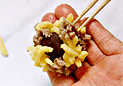 10.指の上に乗せて、回しながら、二種類のきんとん餡を交互に付けていく。 |