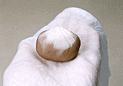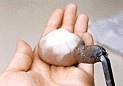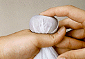 まとめている指はゆるめないで、引っぱった反対側を押さえる。