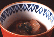 の漬け地に30分漬ける。時間になれば殻をすべてむき取り、食べやすい大きさに切って盛る。少量の漬け地をかけ、すり柚子をかける。