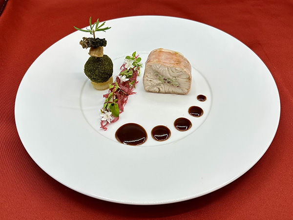 この料理はボラの中にボラのムースを詰め、ベーコンで巻いて焼き上げた一品です。