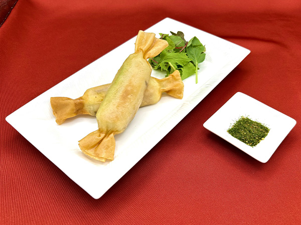 春巻きを西洋風にアレンジし、具にはボラ、チーズ、トマト、アスパラガスといった洋の食材を組み合わせました。