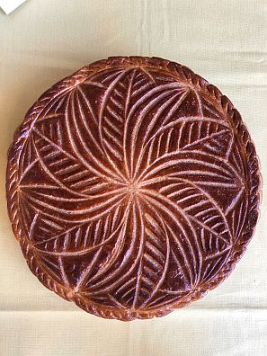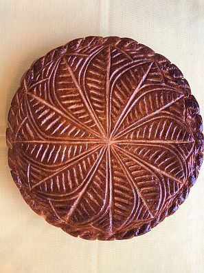 これはエピファニー=公現祭(キリストの顕現を祝う日)に食べられるフランスの伝統菓子です。「フェーブ」という小さな陶器が隠されていて、切り分けた中にその陶器が入っていた人は、その日一日王様となって、お祝いしてもらえるという楽しみもあります。