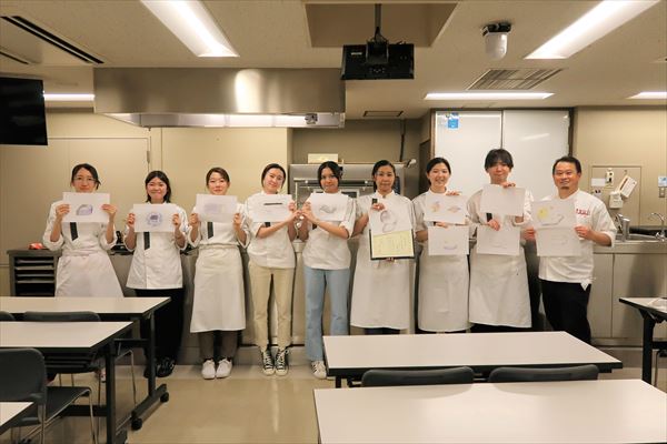 参加した和菓子クラスの学生たち。それぞれのエントリー作品とともに。