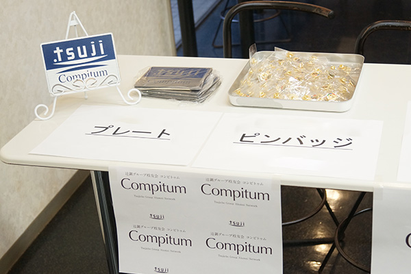 コンピトゥム(辻調グループの卒業生と在校生で構成される校友会)のブースではプレートとピンバッジ。