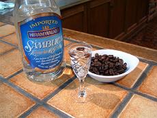 サンブーカに火をつけ、火が消えてからコーヒー豆ごと飲むカクテルです。