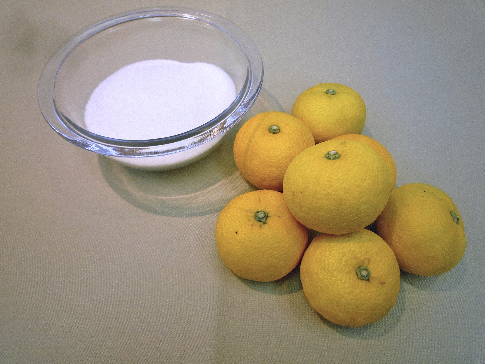 刻んだ皮の重さを量り、同量の砂糖を加える。砂糖を加えたら、30分ほど置いてなじませる。