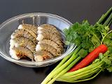エビは殻つきのまま脚をはさみで切りおとし、背中の殻に切り込みを入れる。紹興酒、塩で下味をつける。