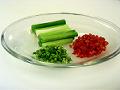 青ねぎは3cmくらいの筒切り、赤とうがらしと香菜はみじん切りにする。