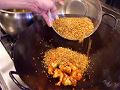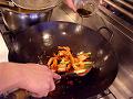 青ねぎ、赤とうがらしを炒めて香りがでたら、揚げておいたエビを鍋に戻し入れる。炒め調味料を加えて味をつける。
