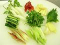 きゅうりは4つ割りにし3cm幅で切る。セロリは筋を取り、姫大根は皮をむき、それぞれ食べやすい大きさに切る。ミョウガは4等分にする。中国パセリは3cm長さに切る。ヤングコーン、大葉は半分に切る。生赤とうがらしは種をとって一口大に切る。にんにくは半分に切り、しょうがは薄切りにし、包丁の腹でたたく。