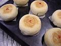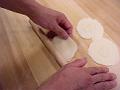 生地を20gに切り分け、麺棒で円形にのばし、木の実餡30gを包み、丸めてから押えて平らにする。
