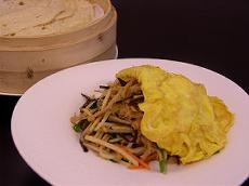 北京料理では定番のアイテムで、種々の野菜と豚肉を細く切って炒めま す。野菜炒めの上に 玉子焼きを載せるので「載帽(帽子を被る)」という名がつきます。薄餅 に包んで食べるのが華北風味の醍醐味です。