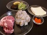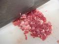 豚肉は赤身肉と脂身を分け、それぞれ6〜7mmの大きさに切る。小エビも同様に切る。