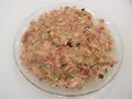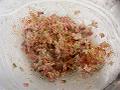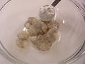 ボウルに小エビを入れ、調味料の塩を加えてたたきつけながら粘りが出るまで混ぜる。