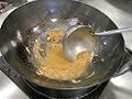 薄力粉が少し色づいたら、5を入れ、もったりするまで練るようにかき混ぜる。