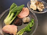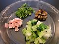 干ししいたけ、ロースハムは5mm角に切る。チンゲン菜は根元に十字に切り込みを入れ、2分間ゆで、1cm角に切り、水分を取る。香菜はみじん切りにする。