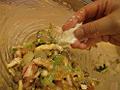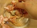鶏とエビをボウルに入れ、餡の味つけの塩を加えてよく練る。