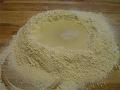 薄力粉、強力粉をよく混ぜ、麺台に山にしておく。中央を窪ませ、水、塩を窪みに入れ、縁を少しずつ崩しながら混ぜる。