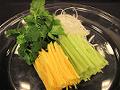 きゅうりは皮を剥き、細切りにする。14の薄焼き卵も細切りにする。香菜は葉を摘む。白ねぎ1/2本は細切りにする。