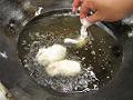 タラバ蟹、カキに16の衣をつけて175℃の油で揚げる。